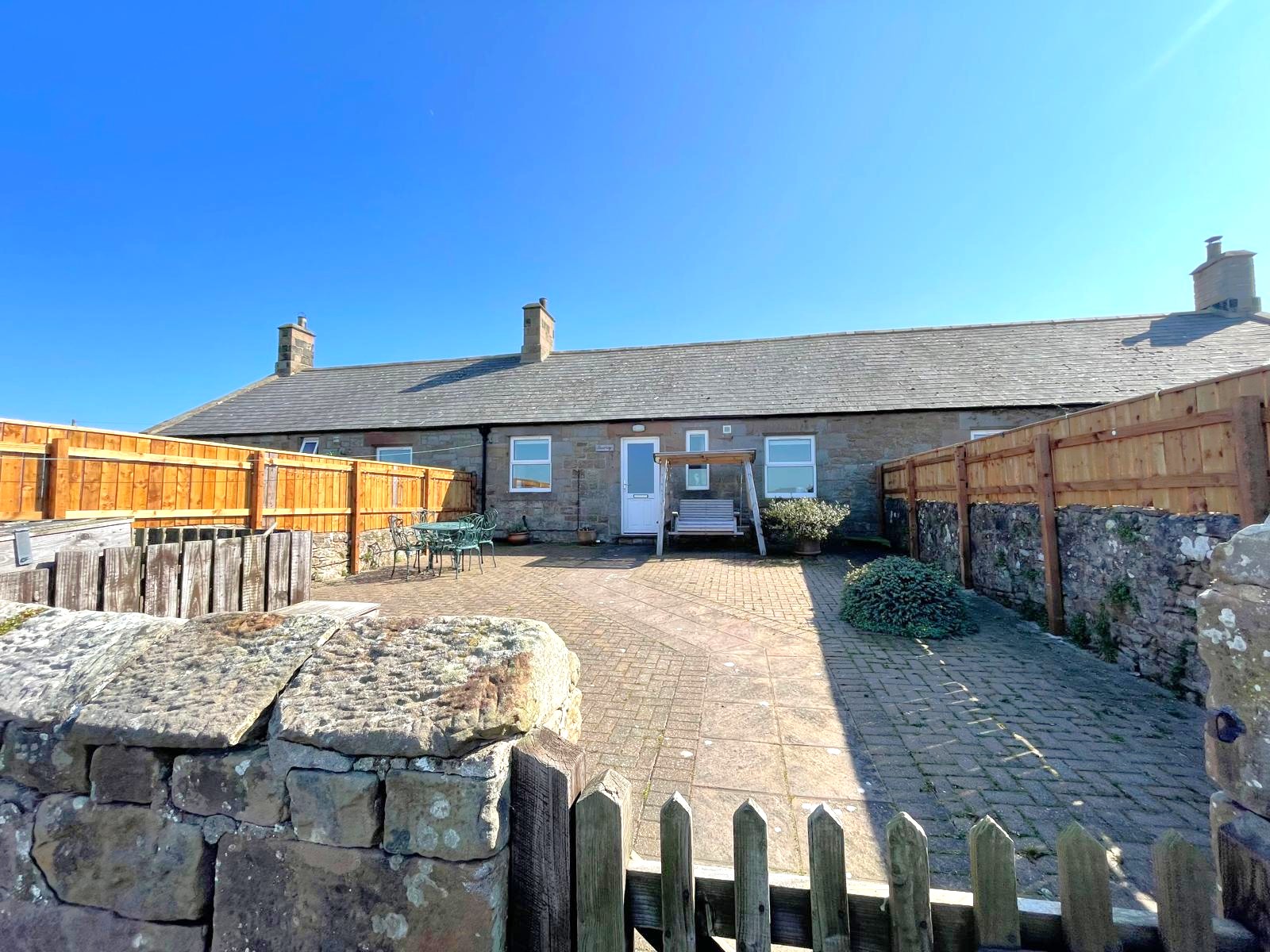 A car is advised due to the rural location. There is private parking with space for two cars adjacent to the cottage. The cottage has its own large enclosed patio area with garden furniture and views over the open countryside – Bamburgh Castle can be seen in the distance.